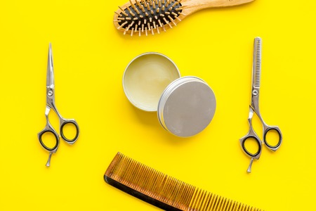barber workspace in barbershop with equipment yellow background top view