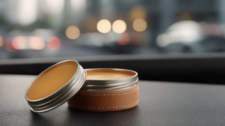 A leather restoration balm placed on the dashboard of a car, with a blurred view of the city streets and traffic in the background.