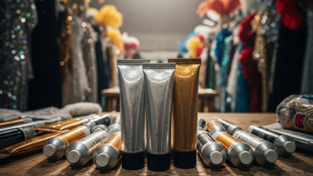 Cinematic wide shot (16:9) capturing unused, thick metallic silver and gold body paint tubes sitting