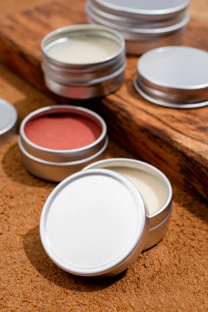colorful lip balms in round tin cases on leather with shadow overlay, mockup design, label
