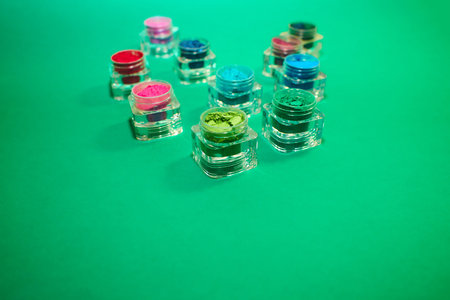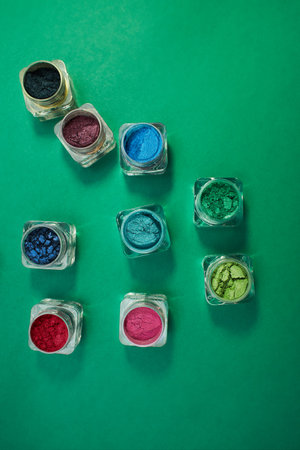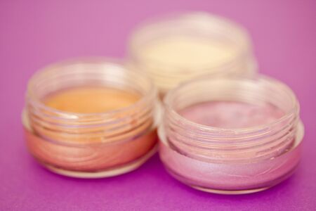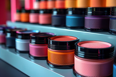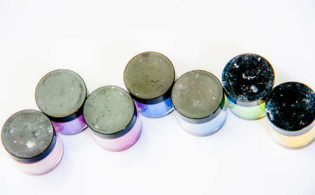 Vibrant mineral eyeshadow in plastic cosmetic jars in row on counter for sale in cosmetics shop, tradeshow. Glamour, fashion, make up, beauty and skincare concept