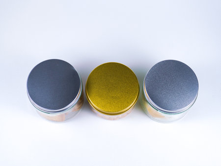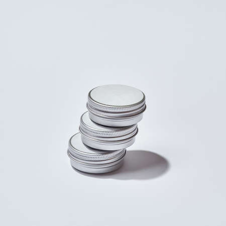 Aluminum round jar for cosmetics. Metalic cosmetic bottles. Blank mock up advertising container with copy space.