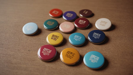Close-up of a set of colorful badges on a brown background