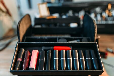 Lipstick collection closeup, professional makeup cosmetic. Make up artist accessories