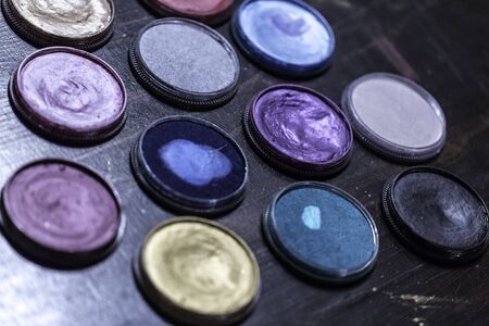 Set of multicolored eye shadows in a box. Selective focus.