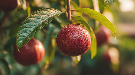 Pair of Ripened Red Guavas Hanging from a Tree Branch Amidst Green Leaves