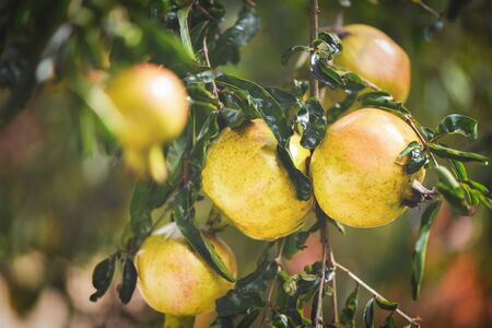 pomegranate fruit on the tree with green nature blurred summer garden background / Asia pomegranate