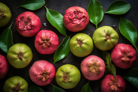 Ripe guavas fruits with leaves on black background.