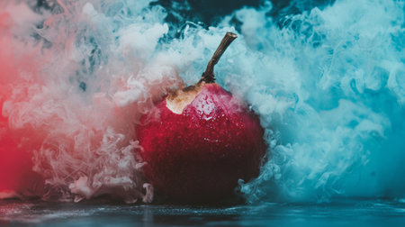 Artistic shot of a red pear surrounded by swirling smoke in blue and red tones, creating a striking and surreal visual effect.