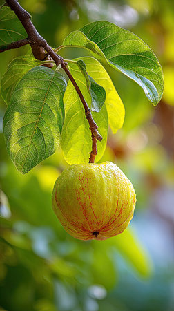 Unripe guava fruits on a tree in the orchard