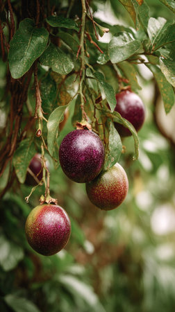 A wide shot of Passion fruit swaying gently in the wind, realistic photography style, bright and vivid colors, natural lighting.