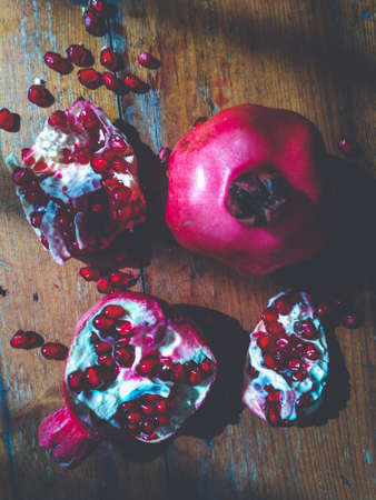 Ripe pomegranate fruit on wooden vintage background