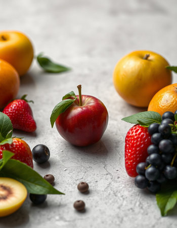 Fruits and berries on grey stone background. Healthy food concept.