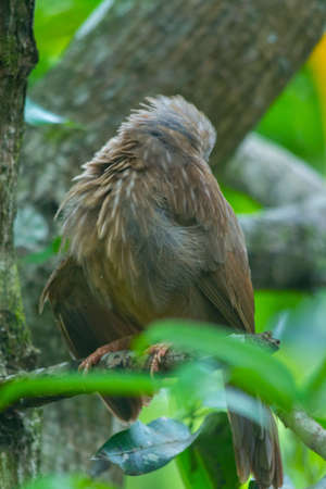 A brown bird is perched on a tree branch, surrounded by green foliage. The bird appears to be resting or observing its surroundings.