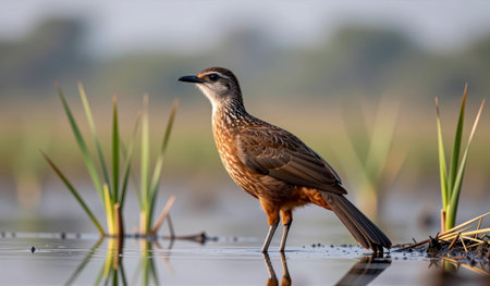 This bird with unique patterned feathers stands proudly at the water's edge, surrounded by tall grasses. The soft morning light adds a serene glow to the tranquil scene.