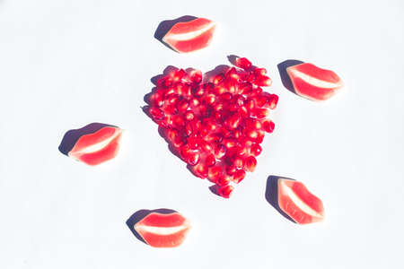 heart of vibrant pomegranate on white background, minimal pop concept