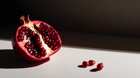 Pomegranate. Open fruit with glistening ruby red arils on a white surface, captured in soft natural light