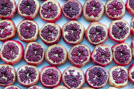 Tasty ripe fresh pomegranates background. Useful vitamins food.