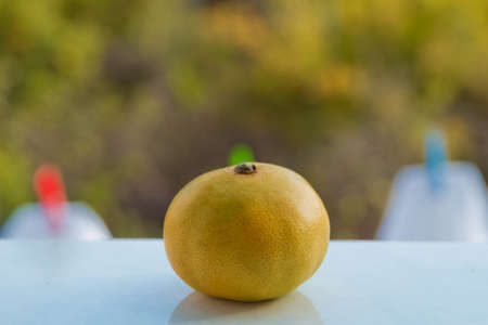 Pomelo fruit hanging on the beautiful skin. Background is blurred leaves of trees with bright rays of light.