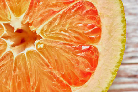 Pulp of a ripe pomelo fruit which was cut across, fragment top view close-up, texture