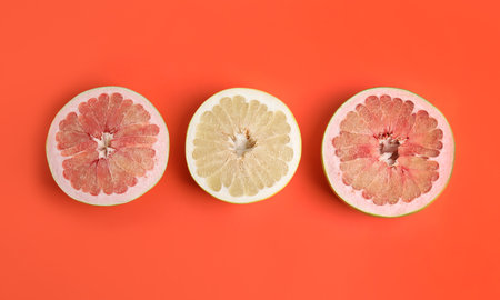 Fresh cut pomelo fruits on red background, flat lay