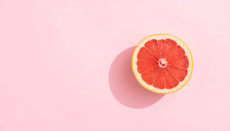 Fresh grapefruit half on a vibrant pink background, showcasing its juicy interior and textured rind, perfect for food photography or summer concepts