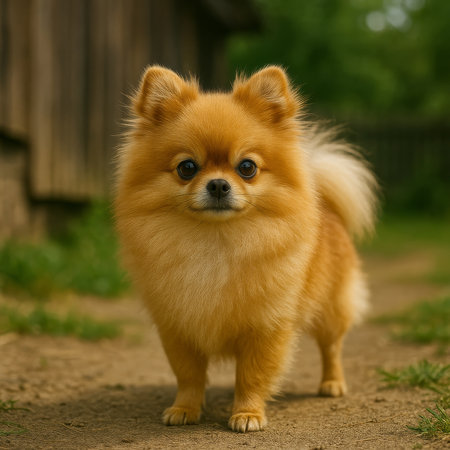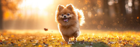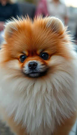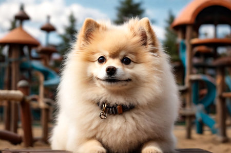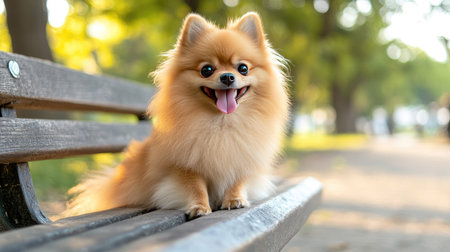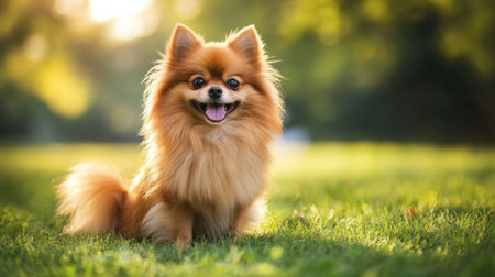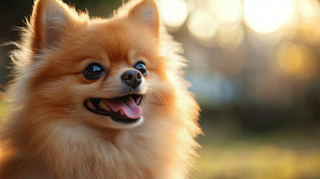 A delightful portrait of a Pomeranian dog showcasing its fluffy fur and happy expression. The image captures the joy and charm of this lively pet in warm, natural light.