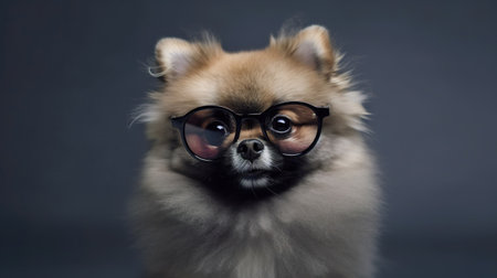 Cute pomeranian dog wearing eyeglasses on dark background. generative ai