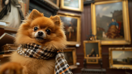 Adorable Pomeranian wrapped in a plaid scarf posing inside an art gallery, surrounded by framed paintings and elegant decor.