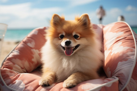 Dog Laid-Back Pomerania Unwinding on Vacation on the beach. Generative AI
