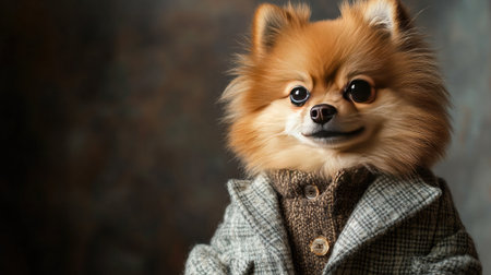 A charming Pomeranian dog dressed in a stylish gray suit with a cozy sweater showcases personality and playfulness in a delightful studio portrait.