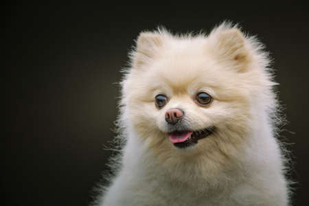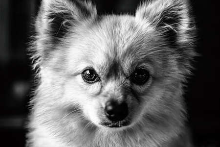 Adorable Spitz Dog. Studio shot. Moody dark lighting, dark background.