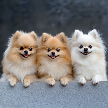Three fluffy dogs with vibrant fur sit closely together with playful expressions showcasing their joy and companionship against a neutral backdrop.