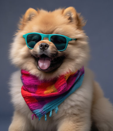 funny chow chow dog wearing scarf and sunglasses.