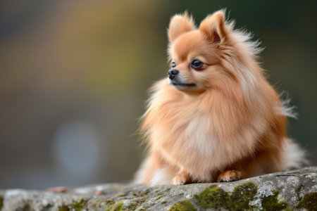 Pomeranian dog sit on the stone in the garden background.