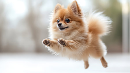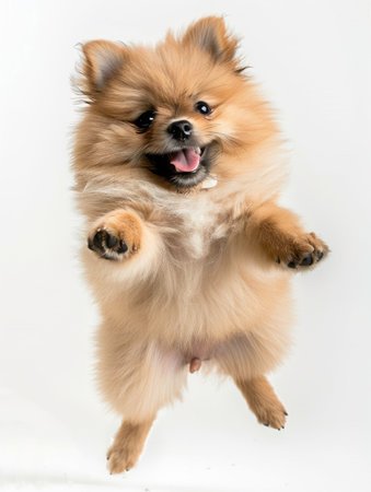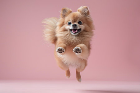 Pomeranian dog Jumping and remaining in mid-air, studio lighting, isolated on pastel background, stock photographic style