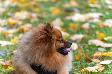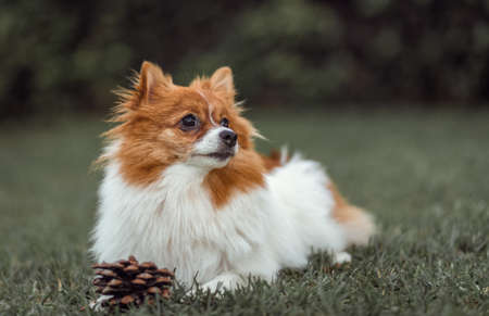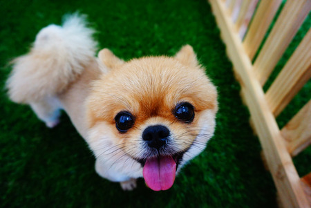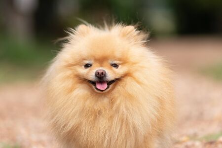 Portrait of smile cute pomeranian dog at the park. Beautiful dog