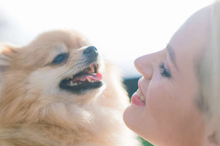 Close up portrait of smiling young attractive woman embracing Pomeranian spitz.