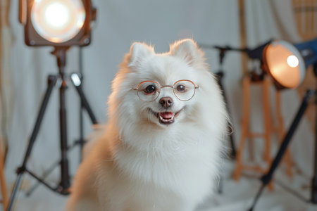 A cheerful white dog, adorned with glasses, sits comfortably in a bright studio, surrounded by soft lighting. The playful expression on its face captures the attention of everyone nearby.