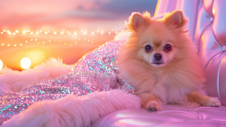 A cute fluffy dog relaxes on a shiny pink couch, wrapped in a glittery blanket. The warm sunset colors and bokeh lights create a whimsical atmosphere.