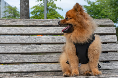 An attentive Pomeranian looks to the side while sitting on a wooden bench. Trees and buildings can be seen in the background