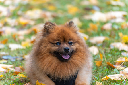 Cute Pomeranian dog standing in the park and looking at the camera