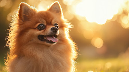 A cheerful Pomeranian dog sits outdoors basking in warm sunlight. Its fluffy fur glows beautifully in the golden light, radiating happiness and charm.
