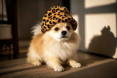 Cute pomeranian dog with leopard hat in the room