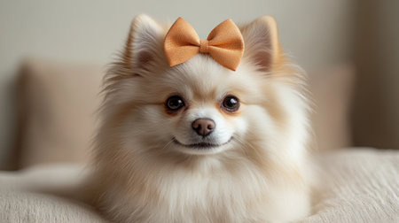 A playful pomeranian with a bright bow exudes charm while resting comfortably indoors.
