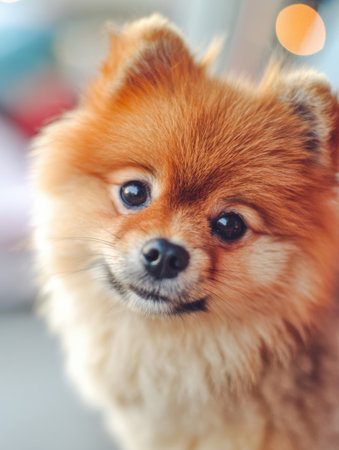 A fluffy Pomeranian dog gazes warmly, surrounded by soft bokeh lights that create a charming pastel atmosphere, enhancing its cuteness.