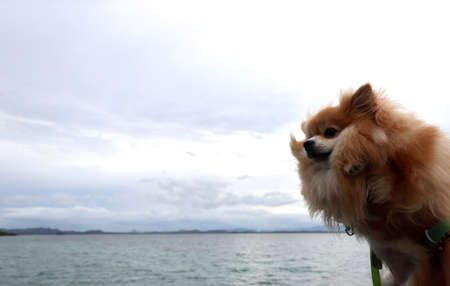Brown color fluffy Pomeranian head shot with sky and ocean background