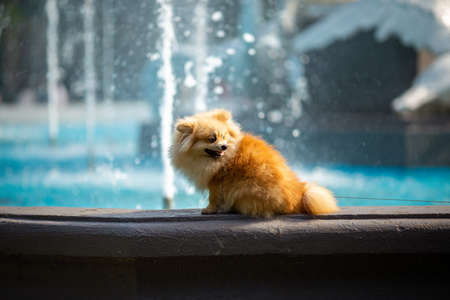 A handsome Pomeranian is near the fountain and looks to the side. Blue background