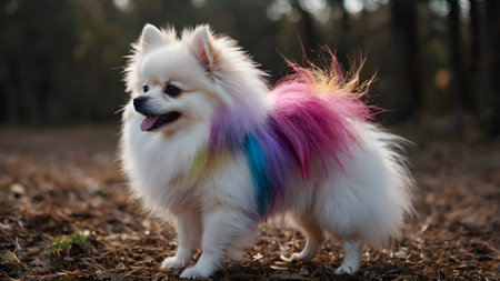 a Pomeranian in bright colors and neon lights is digital photography, in dreamlike architectural styles, hyper-realistic pop, seapunk, marble, retro charm, soft tone range, honeycore, 4k image, Canon EOS R5. --ar 2:1 --style raw --stylize 400 --v 6.1 Job ID: b2e1f3f2-7e52-4f91-a37b-d4e961b8e460