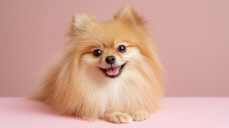A cheerful Pomeranian dog lounges comfortably on a soft pink surface, showing its fluffy golden fur and bright eyes. Its happy expression brings joy and warmth.